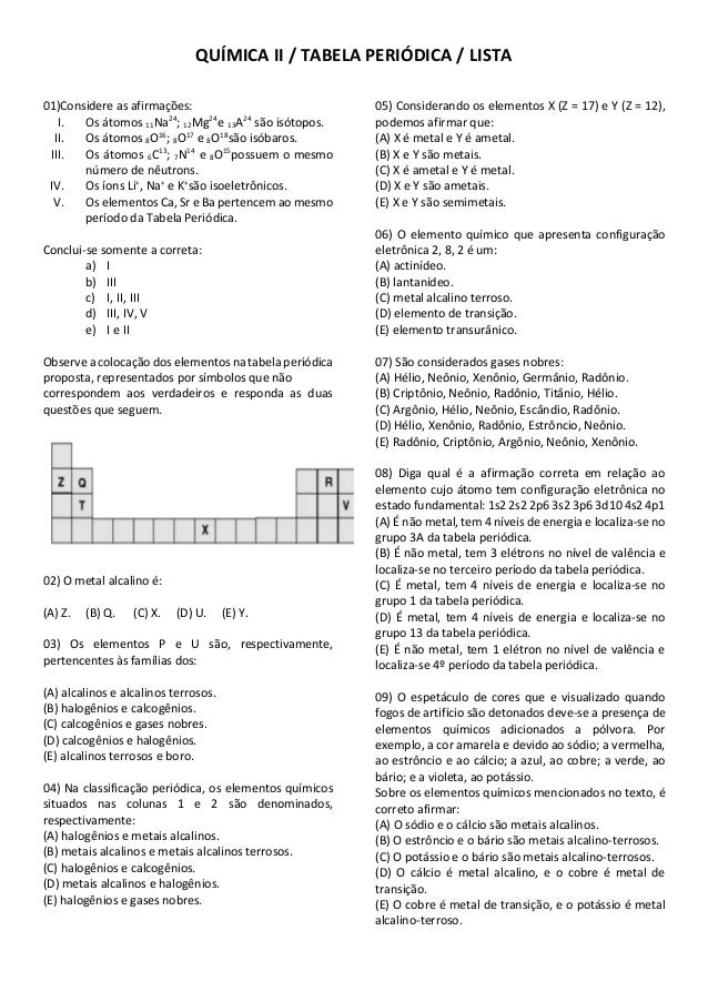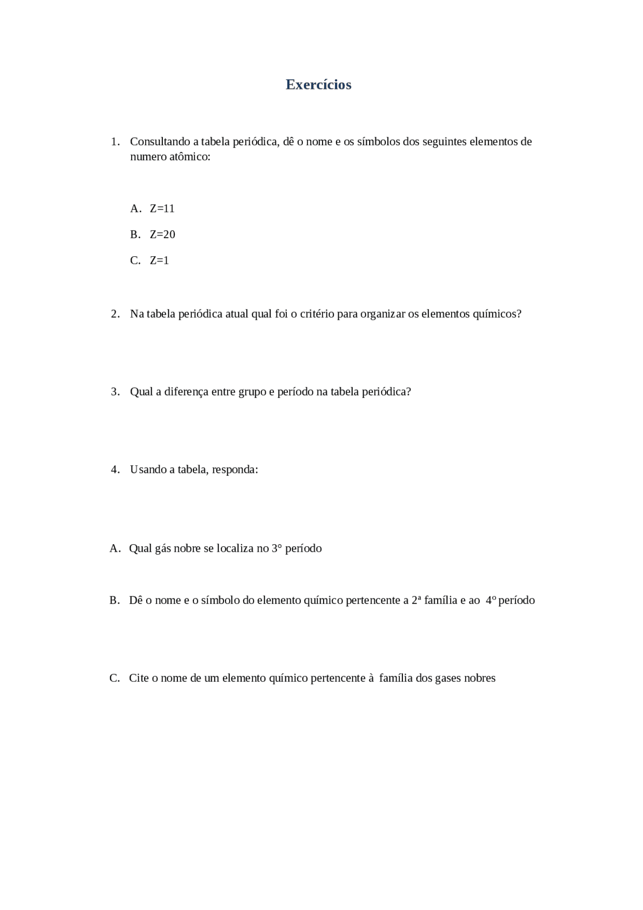Exercícios classificando elementos químicos, 9º ano ciências fundamental. 1) Na tabela periódica, os elementos estão dispostos em ordem crescente de: A) Número atômico. B) Número de massa. C) Tamanho. D) Raio atômico. Resposta: a. 2) Cada fila vertical da tabela periódica denomina-se: A) Período.