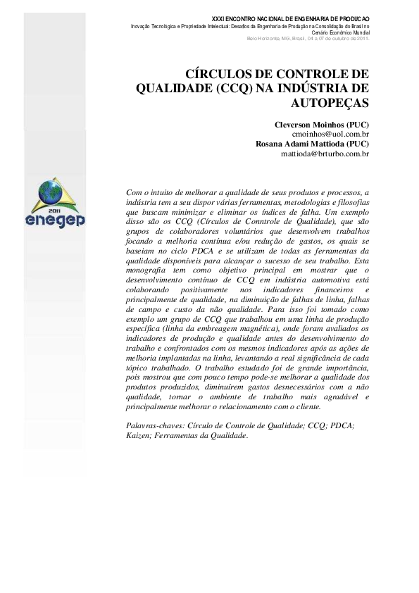 (PDF) CÍRCULOS DE CONTROLE DE QUALIDADE (CCQ) NA INDÚSTRIA DE AUTOPEÇAS Alexsandra Araujo