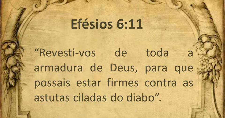 A armadura de Deus. 10 No demais, irmãos meus, fortalecei-vos no Senhor e na força do seu poder. 11 Revesti-vos de toda a armadura de Deus, para que possais estar firmes contra as astutas ciladas do diabo; 12 porque não temos que lutar contra carne e sangue, mas, sim, contra os principados, contra as potestades, contra os príncipes das.