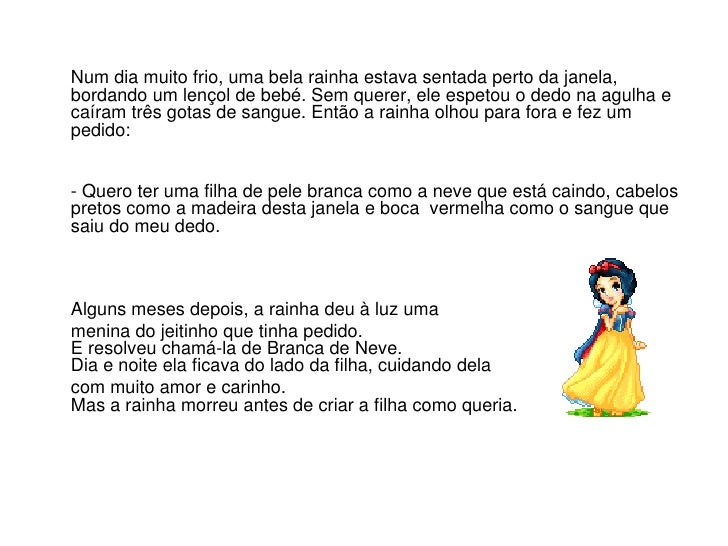 3. Branca de neve. Há muito tempo, morava em um castelo uma rainha que estava bordando em frente a uma janela. Ao ver a paisagem coberta de neve, espetou o dedo na agulha. Ela então fez um pedido: que tivesse uma filha branca como a neve, com os lábios vermelhos como o sangue os cabelos pretos como o a madeira de ébano.