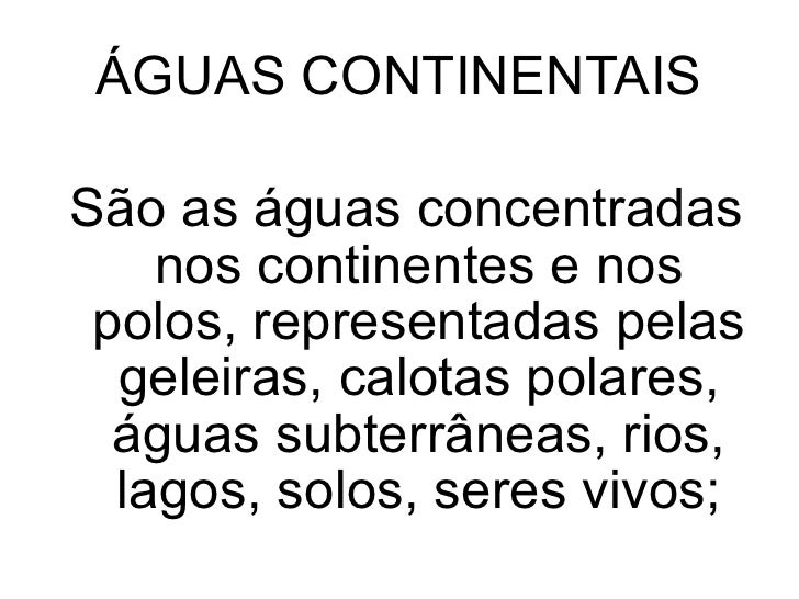 As águas continentais representam uma fonte insubstituível da substância base para a manutenção da vida terrestre, a água doce, embora uma parte considerável dessas águas interiores seja salgada. O que são águas continentais Características principais Tipos de águas continentais Rios, riachos e córregos Lagos, lagoas e mares.