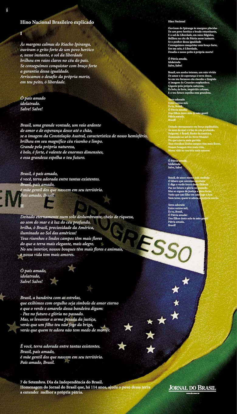 O Hino Nacional Brasileiro data de 1831, enquanto a letra foi escrita em 1909.. Fulguras, ó Brasil, florão da América, Iluminado ao sol do Novo Mundo!. Salve! Brasil, de amor eterno seja símbolo O lábaro que ostentas estrelado, E diga o verde-louro dessa flâmula - Paz no futuro e glória no passado. Mas se ergues da justiça a clava.