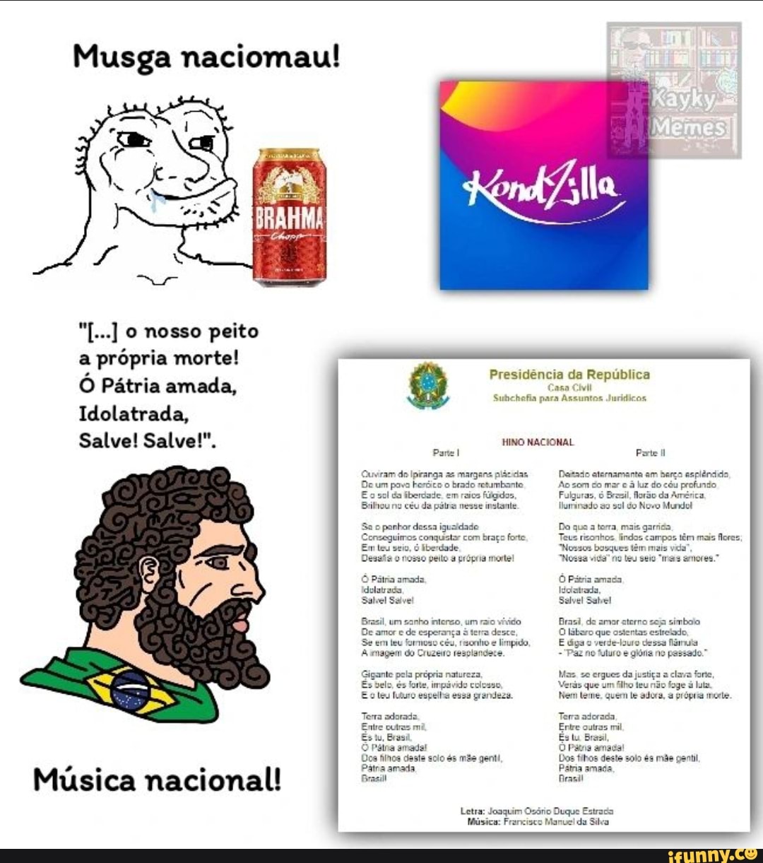 Musga naciomau! o nosso peito a própria morte! Ó Pátria amada, Idolatrada, Salve! Salve