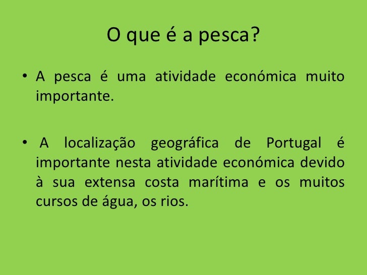Importância da Pesca. Sendo Portugal um país com ampla costa marítima 942km de costa continental e duas vastas zonas arquipelágicas, a pesca foi e ainda é uma actividade económica relevante. Pode-se dizer que Portugal está, não só geograficamente, mas também tradicional e culturalmente, ligado ao mar. Com uma costa de mar abundante em.