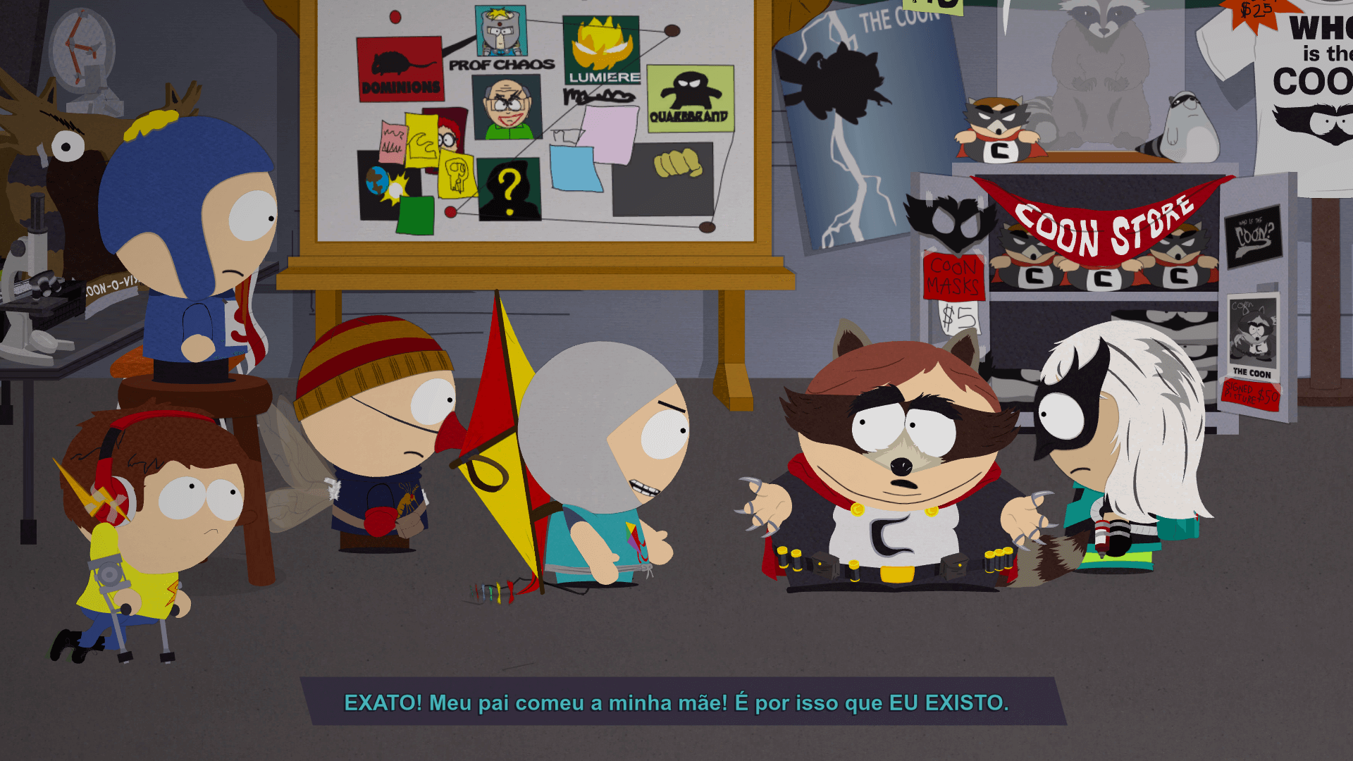 Cartman - The Coon . Esse misterioso e um tanto mimado vigilante usa garras afiadas de metal para "proteger" a cidade de South Park. Entre aspas mesmo. Porque assim como Cartman, o Coon é um babaca egocêntrico e sociopata. Em um episódio da série, o "herói" até invocou o deus antigo Cthulhu para destruir todos os seus inimigos (e.