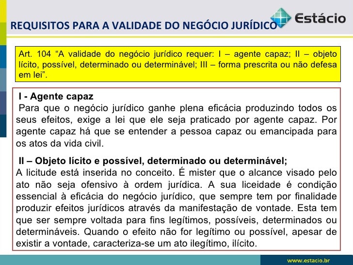 Validade de Negocios Juridicos VALIDADE DO NEGÓCIO JURÍDICO 1 agente capaz 2 objeto licito 3
