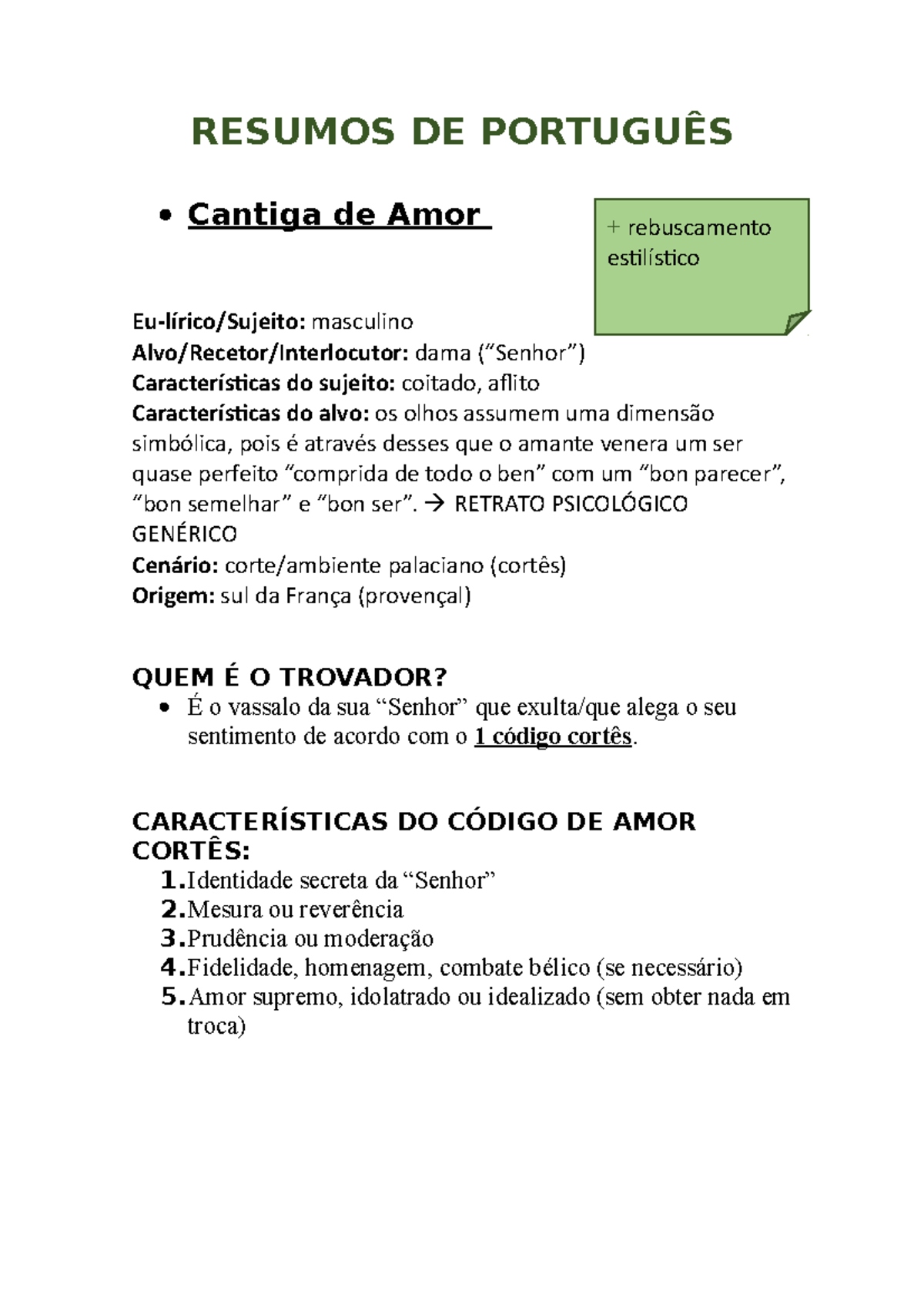 Resumo de Português Cantigas de amor e de amigo RESUMOS DE PORTUGUÊS Cantiga de Amor Studocu