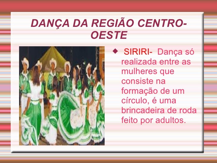 → Danças da região Centro-Oeste.. Siriri: dançados por homens vestidos em roupas coloridas e portando chapéu com fitas, mulheres de amplos vestidos coloridos e, também, crianças, os.
