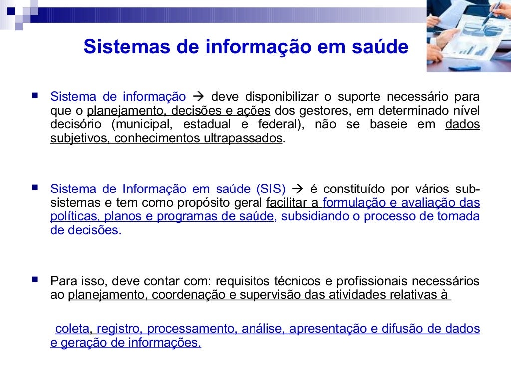 Sistema de Informações de Saúde (SIS) - Resumo tema: sistemas de informação em saúde (sis) na concepção do sistema único de saúde (sus), um dos objetivos. Ir para o documento. Universidade; Ensino Médio.. Conceitualmente, o sistema de informação em saúde pode ser entendido como um instrumento para adquirir, organizar e analisar.